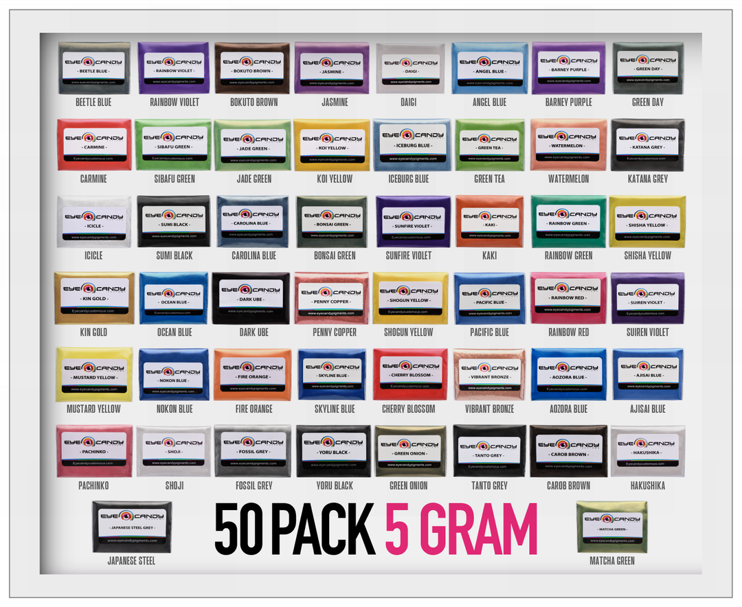 With our 30, 50, 120-pack sample pigments, you’ll have mica powder to enhance woodworking projects, resin creations, candle making, and so much more. Plus, our mica pigment powder is safe to use on the skin, so you can also craft cosmetics with it. Your creative options are endless! Contact us with any questions about our 30, 50, 120-pack mica pigment. You’ll reach Eye Candy’s support team by calling 386-281-3463 or emailing jeff@eyecandycustomz.com.
